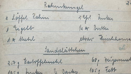 Als meine Großmutter vor ein paar Jahren starb, erbte ich ihr kleines, handgeschriebenes Backbuch. Meine Großmutter wurde 1921 in Königsberg geboren, machte Abitur, eine Ausbildung als Sekretärin, hätte eigentlich gern studiert. Dann kam der Krieg dazwischen, und plötzlich fand sie, die moderne junge Frau aus der Großstadt, sich auf dem Land in Schleswig-Holstein wieder. 1947 heiratete sie meinen Großvater, einen Landwirtund wurde dann doch die Hausfrau, die sie eigentlich gar nicht sein wollte.Und zu dieser Zeit begann sie, ihre Backrezepte zu notieren. Zunächst sehr ordentlich, in gestochener Schrift. Manchen Rezepten merkt man die Nachkriegszeit an. Marzipan wird, statt aus Mandeln, aus Mehl, Milch und Bittermandelaroma zusammengekocht.Das Rezept für Honigbonbons sieht neben sehr viel Zucker einen halben Esslöffel Kunsthonig vor. So genannte falsche Florentiner machte sie mit Haferflocken und Sirup (die echten macht man mit Mandeln und Schokolade). Im Verlauf des Buchs, das sie bis in die 70er weiterführte, wird ihre Schrift ein bisschen weniger ordentlich und die Rezepte zeugen vom Wirtschaftswunder: Auf einmal häufen sich die Rezepte mit Orangen, Ananas und Bananen, der Mangel ist überwunden. Manchmal schreibt sie die Quelle eines Rezepts dazu, es gibt „Zitronenkuchen Frau Keune“ und „Apfelkuchen K. Barth“, es gibt ausgefuchste Torten und auch ein paar Rezepte, die ich meiner in der Küche eigentlich fitten Großmutter posthum fast ein bisschen übelnehme, wie „Quark mit Nescafé“.Letzterenwürde ich natürlich nie nachmachen, ein paar Plätzchenrezepte habe ich aber ausprobiert. Und das hierfand ich ziemlich gutund mache es seitdem jedes Jahr.