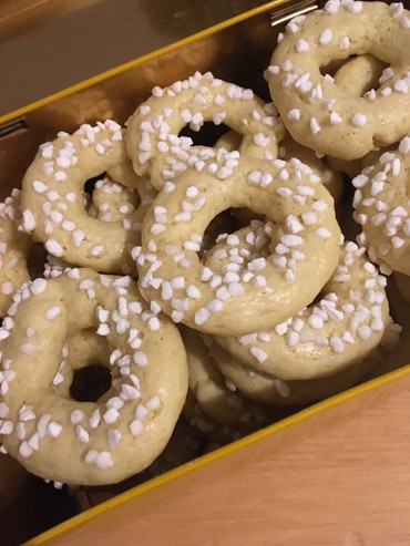 Ich habe mir erlaubt, die Kringel in Hagelzucker zu wälzen, ihr könnt ihn aber auch weglassen.Dinge wie Teigzubereitung und Backzeit gibt meine Großmutter aus Prinzip nicht an. Eine richtige Hausfrau weiß das schließlich. Ich habe versucht, sie korrekt zu rekonstruieren.
