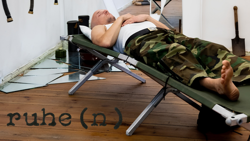 In der Performance wird die Geschichte eines Soldaten, eines Heimkehrers und Zurückkehrers erzählt. Er ruht auf einem Feldbett im Chor der Kirche und wird zur Waffe gerufen, doch er rührt sich nicht. Eine zurückhaltende Klang-Collage aus Meeresrauschen und Wind, einem Hühnerstall und dem Läuten diverser Glocken mischen sich mit Geräuschen von Drohnen, Helikoptern, Kampfjets, Sirenen und Detonationen sowie abstrakten Klängen. Sie wird getragen von einem sich Mantra-ähnlich wiederholenden Text: der Aufforderung zum Dienst an der Waffe. Dieser zeitversetzte Weck-Ruf scheint zu verhallen. Der Resonanzraum des Rückzugsortes in der St.-Thomas-Kirche erweist sich als eine urrealistische Inszenierung einer Utopie aus Artefakten des Vergangenem; Spiegelfragmente, Werkzeuge, Gasmasken, sowie als imaginärer Sehnsuchtsort einer Zukunft zwischen Krieg und Frieden.